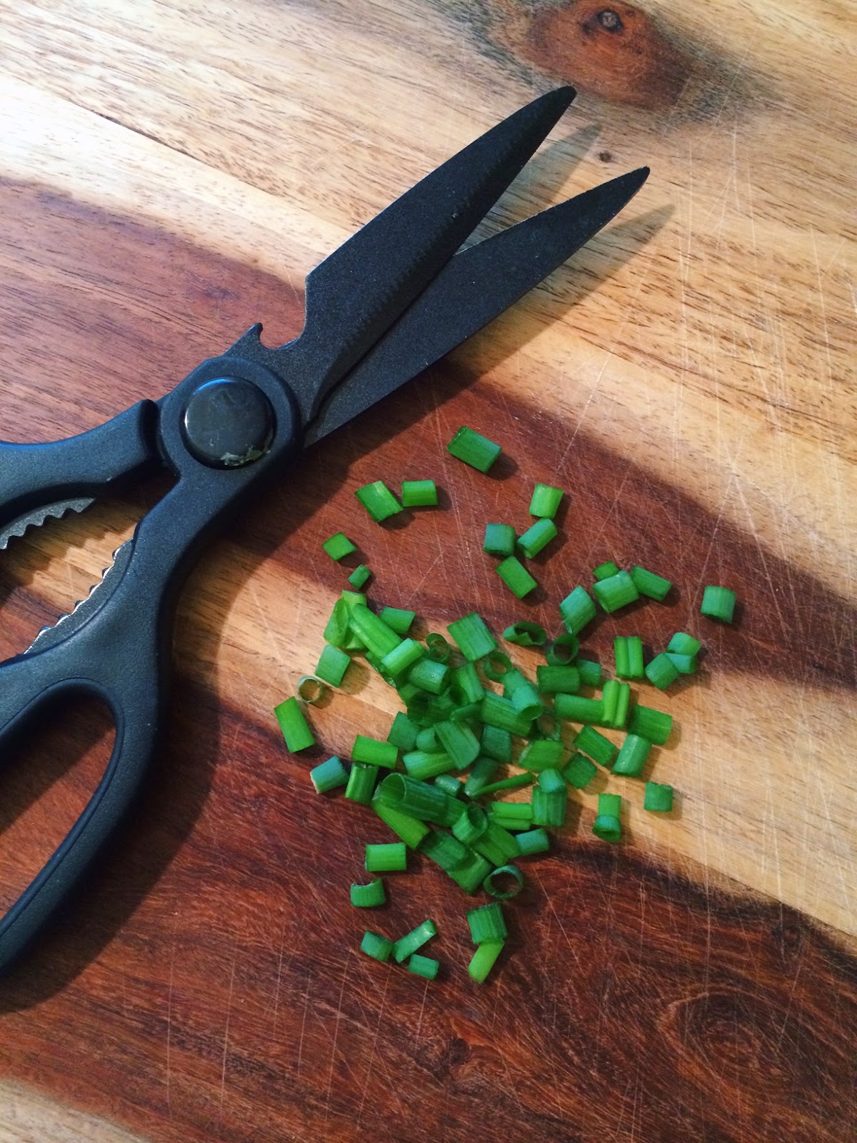 Slice (or cut) your green onions. I usually would use a little bit more than pictured here, but we are growing our own and this was all that happened to be on hand at the time.